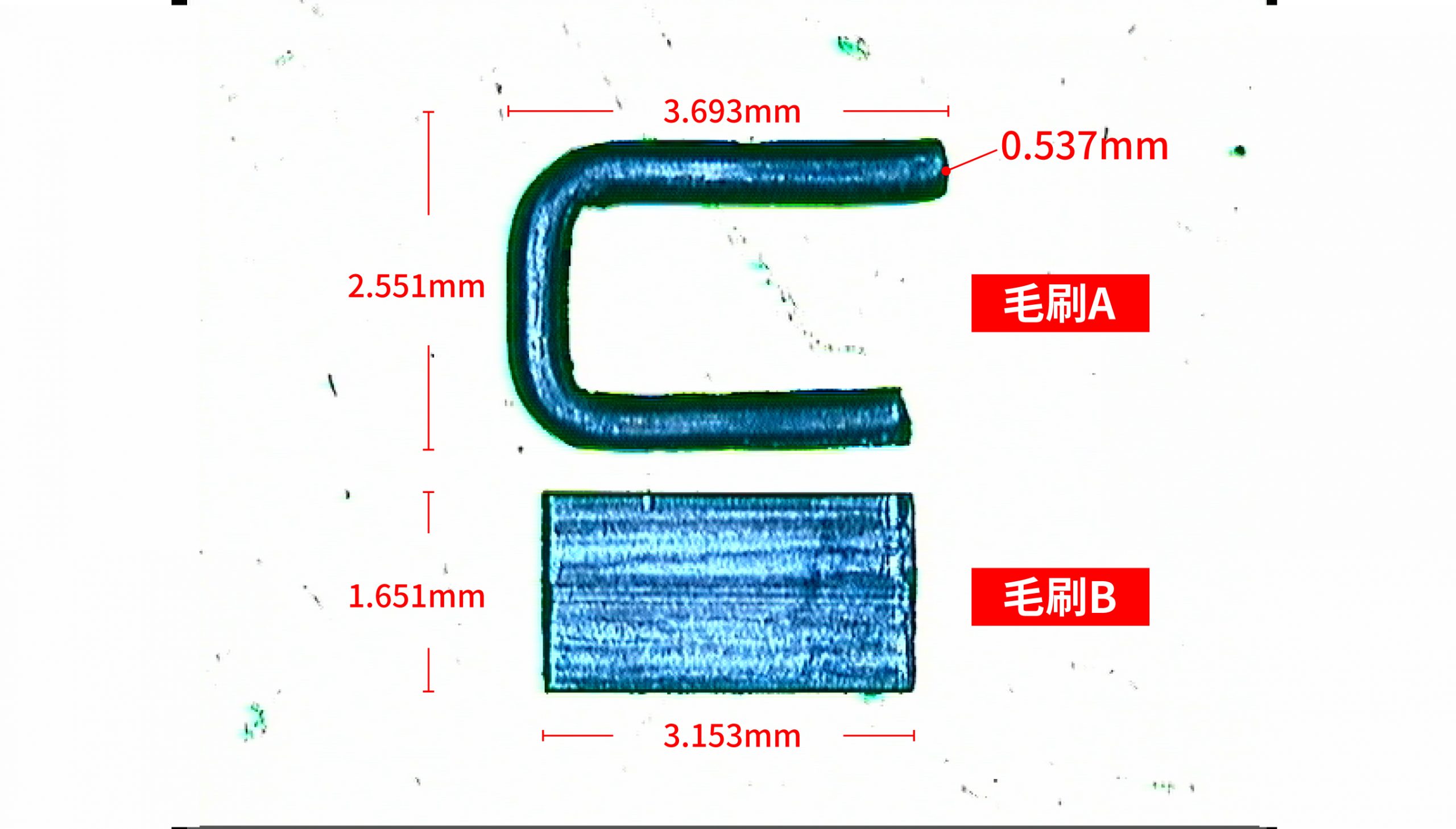 我们还发现,毛刷A和毛刷B植毛的固定方式不一样,毛刷B所使用的一块小钢片,而毛丝A使用的是U型铁丝。通过测量,发现钢片的体积比U型铁丝体积小,因此毛刷B可以植入的毛丝量更多。